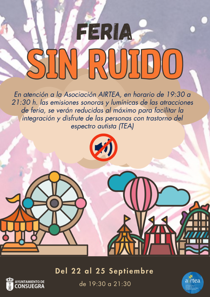 En atención a la Asociación AIRTEA, en horario de 19:30 a 21:30h. las emisiones sonoras y lumínicas de las atracciones de feria, se verán reducidas al máximo para facilitar la integración y disfrute de las personas con trastorno del espectro autista (TEA)