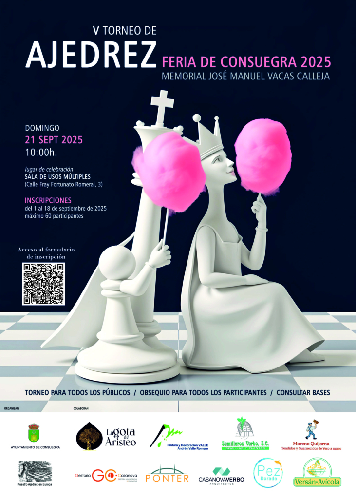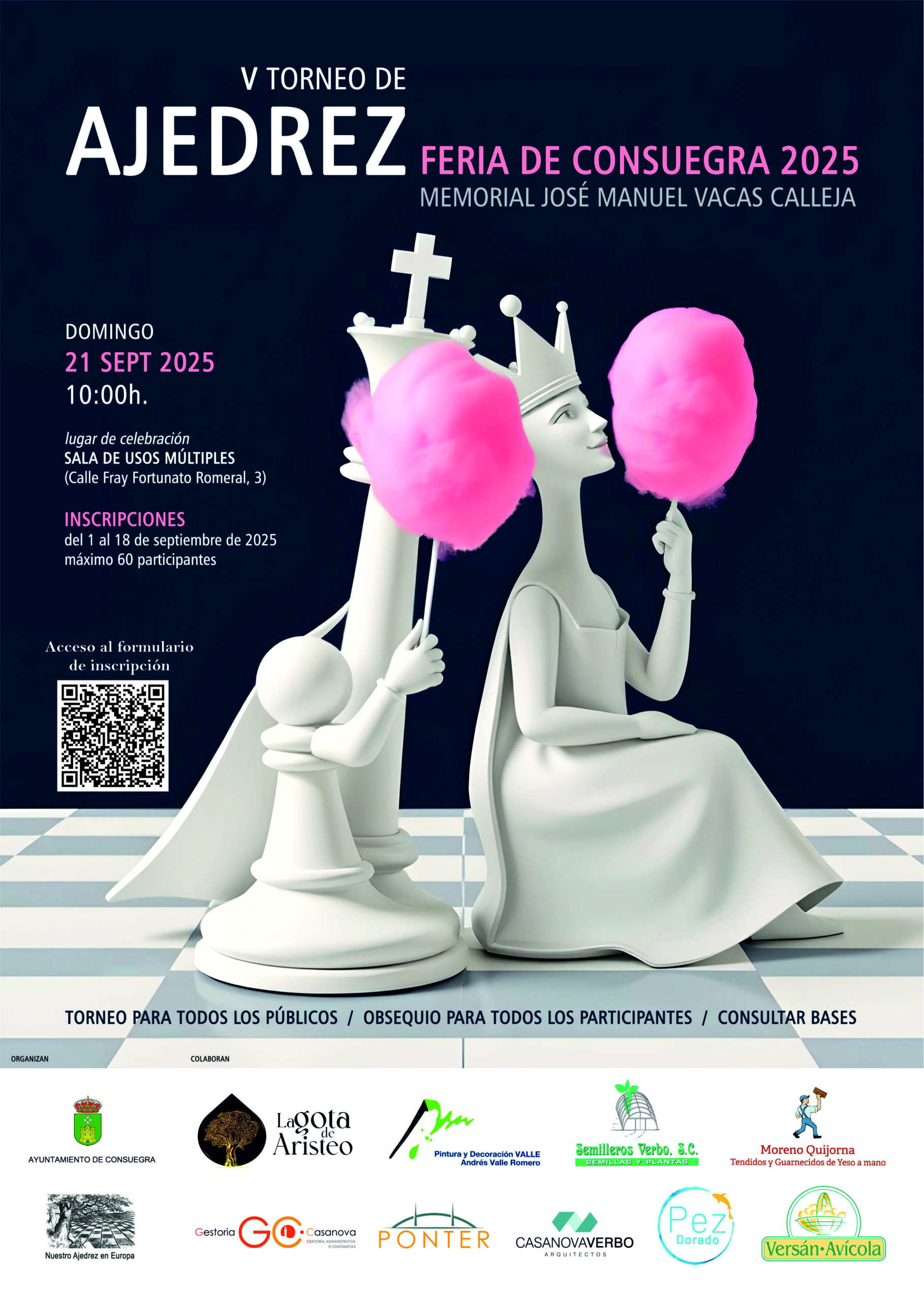 10:00h. En Sala de Usos Múltiples (C/ Fray Fortunato Romeral, 3 – Antiguo Convento Franciscano) V Torneo de Ajedrez Feria de Consuegra 2025 «Memorial Jose Manuel Vacas Calleja».