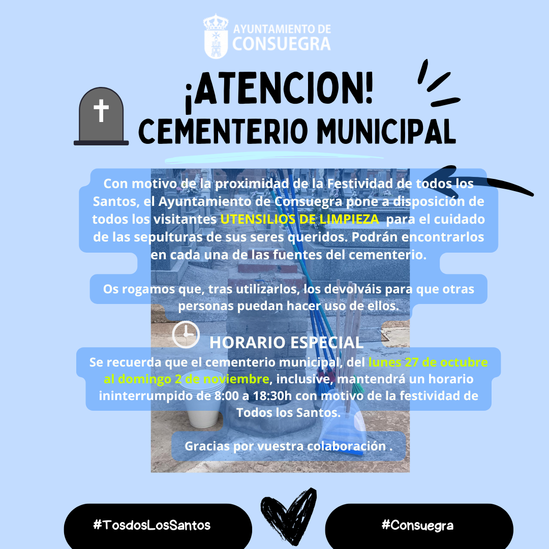 Con motivo de la proximidad de la Festividad de todos los Santos, el Ayuntamiento de Consuegra pone a disposición de todos los visitantes utensilios de limpieza para el cuidado de las sepulturas de sus seres queridos.