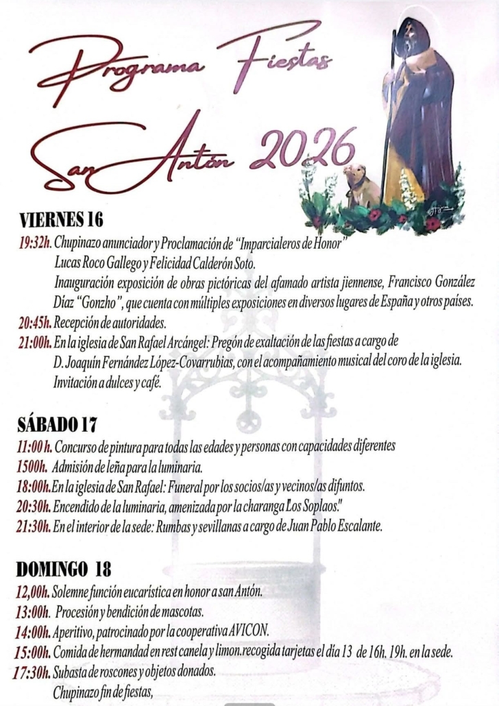 21:00 Pregón de exaltación de las fiestas de San Antón en la iglesia de San Rafael a cargo de D. Joaquín Fernández López-Covarrubias, con el acompañamiento del coro de la iglesia. Invitación a dulces y café.