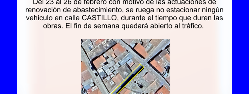 Se informa que, con motivo de las actuaciones de saneamiento y renovación de la red de abastecimiento de agua potable dentro de este término municipal, del 23 al 26 de febrero, ambos se ruega que ningún vehículo esté aparcado en el tramo señalado de la C/Castillo (el fin de semana quedará abierto el tráfico).