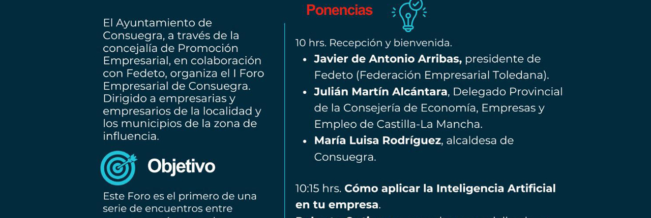Nº de visitas: 1.648 🔥 Consuegra se mueve… ¡y tú formas parte del cambio! El próximo 28 de abril nace algo grande: el I Foro Empresarial de Consuegra (Toledo). Una cita pensada para impulsar ideas, conectar talentos y transformar el futuro de nuestros negocios. 🚀 Si eres emprendedor, empresario o simplemente tienes ganas de crecer, … Sigue leyendo I Foro Empresarial Consuegra