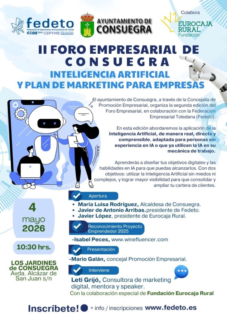 El Ayuntamiento de Consuegra, a través de la Concejalía de Promoción Empresarial, organiza la segunda edición del Foro Empresarial, en colaboración con la Federación Empresarial Toledana (FEDETO)