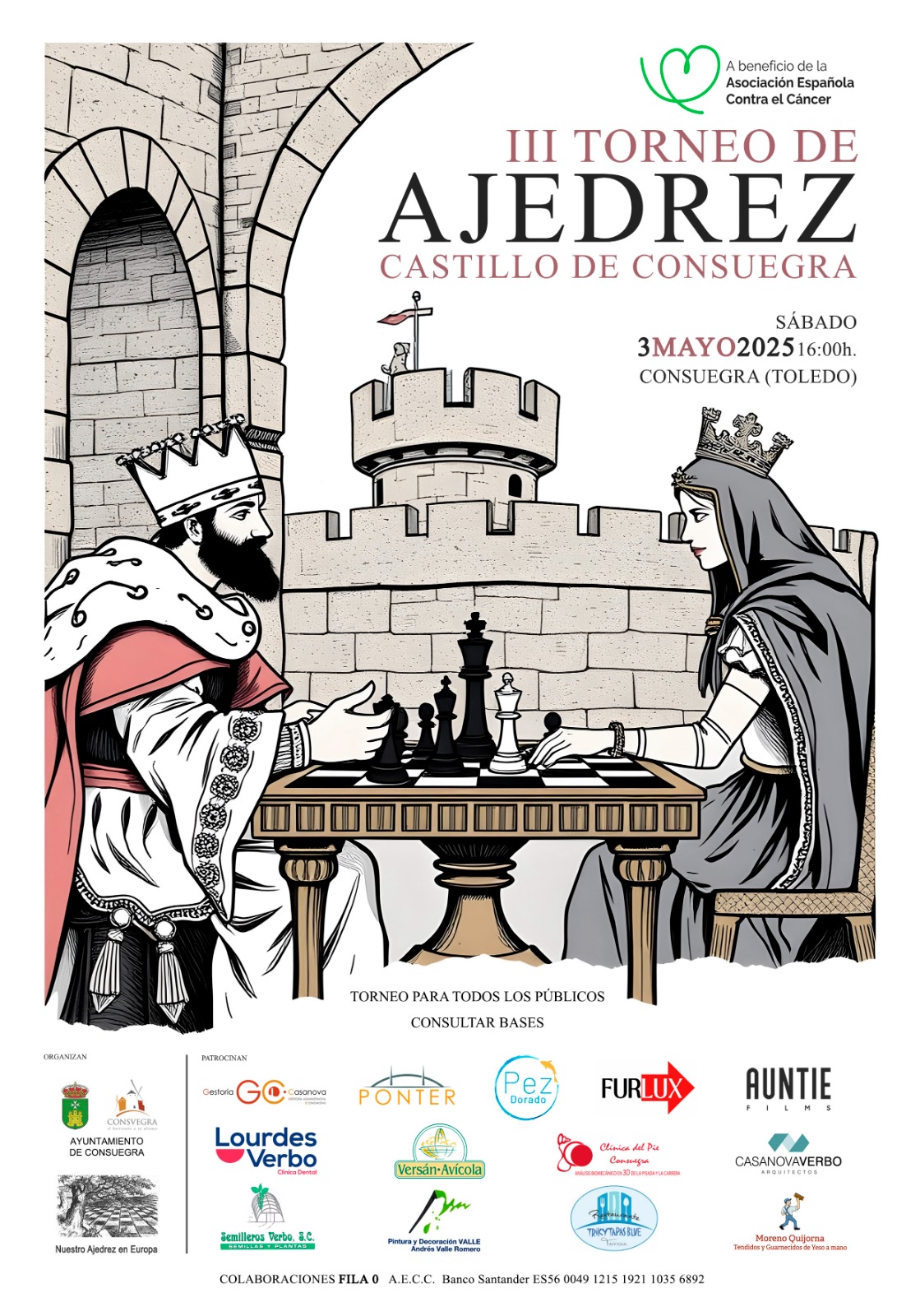 El Ayuntamiento de Consuegra junto a C.D Nuestro Ajedrez en Europa, presentan la tercera edición TORNEO DE AJEDREZ 2025 que tendrá lugar el 3 de mayo en el Castillo de Consuegra, con recaudación benéfica a favor de la Asociación Española Contra el Cáncer.