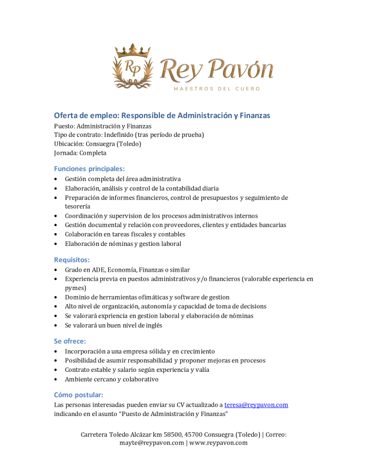 Ofertas Empleo Privado: Responsable de Administración y Finanzas (Rey Pavón) PLAZA CUBIERTA