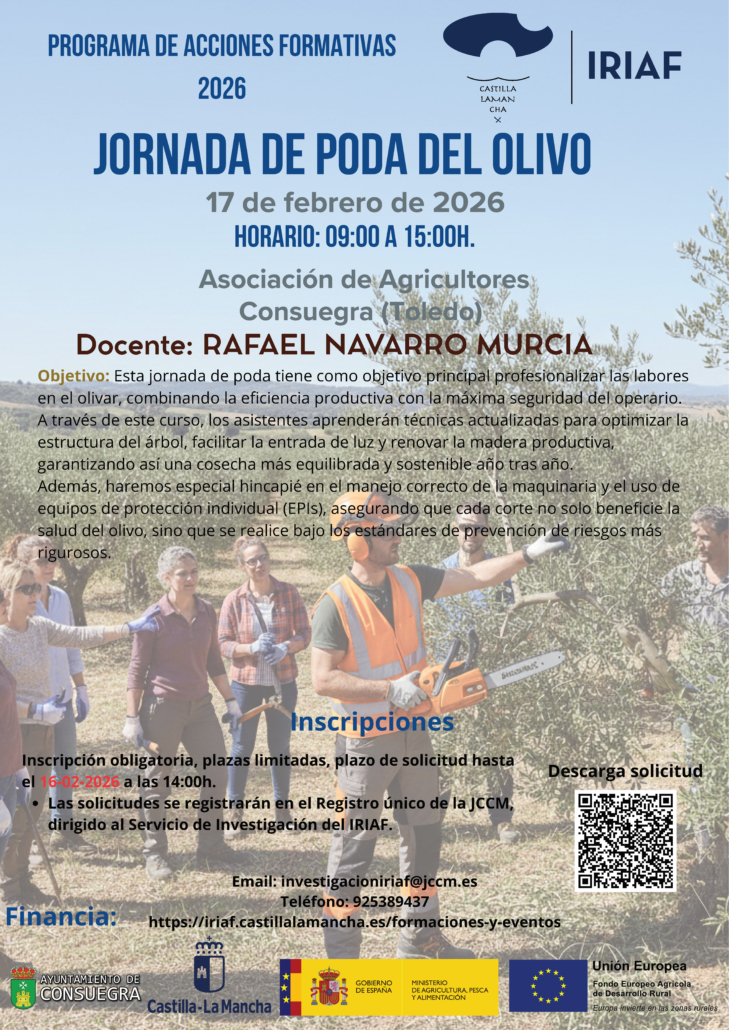 El Instituto Regional de Investigación y Desarrollo Agroalimentario y Forestal (IRIAF), organiza Jornada de Poda del Olivo en Consuegra, próximo 16 de febrero en Consuegra.