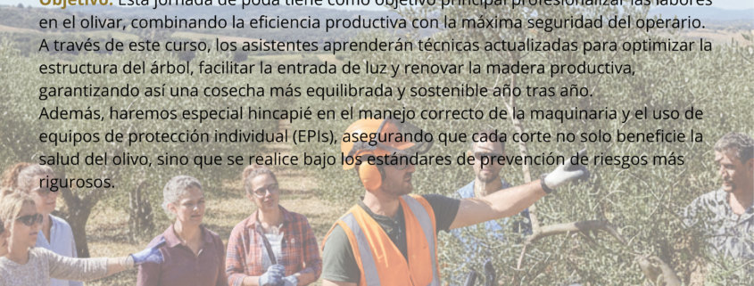 Esta jornada de poda tiene como objetivo principal profesionalizar las labores en el olivar, combinando la eficiencia productiva con la máxima seguridad del operario.