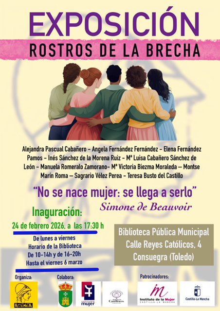 El Excmo. Ayuntamiento de Consuegra a través del Centro de la Mujer y en colaboración con la Asociación de Mujeres Nuevos Caminos de Consuegra, anima a toda la ciudadanía a participar del acto inaugural el 24 de febrero, y a visitar la exposición.