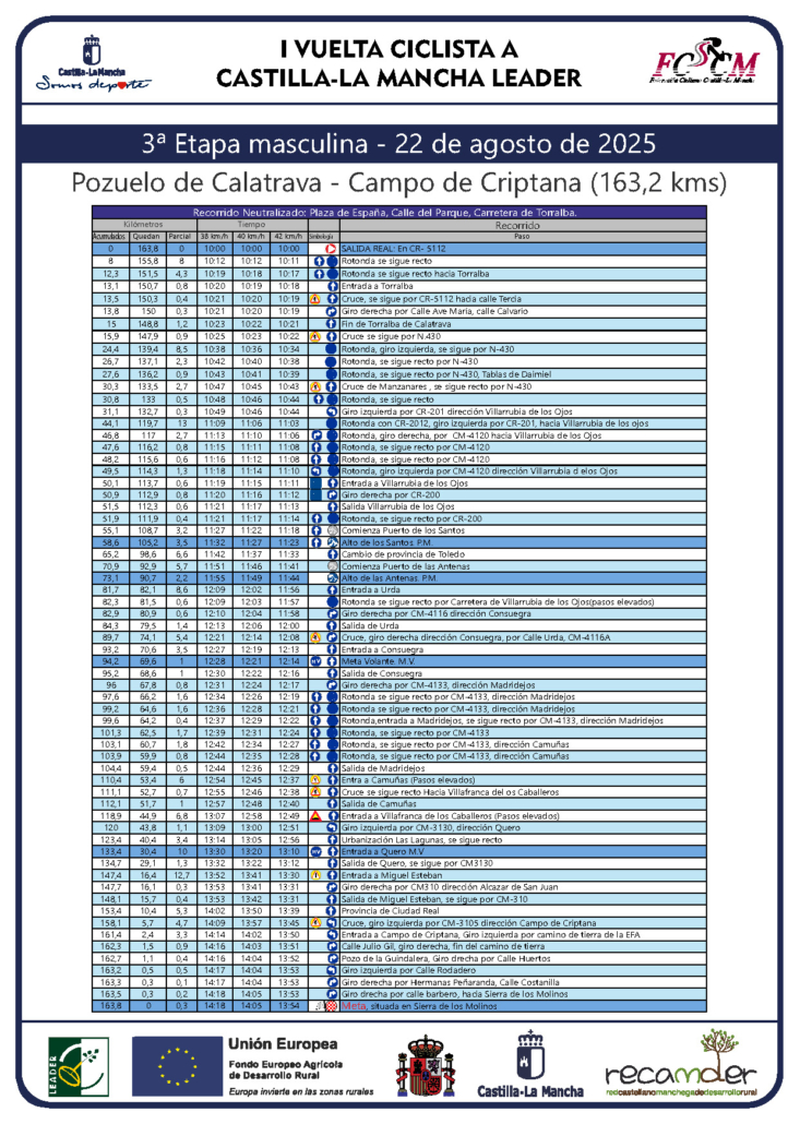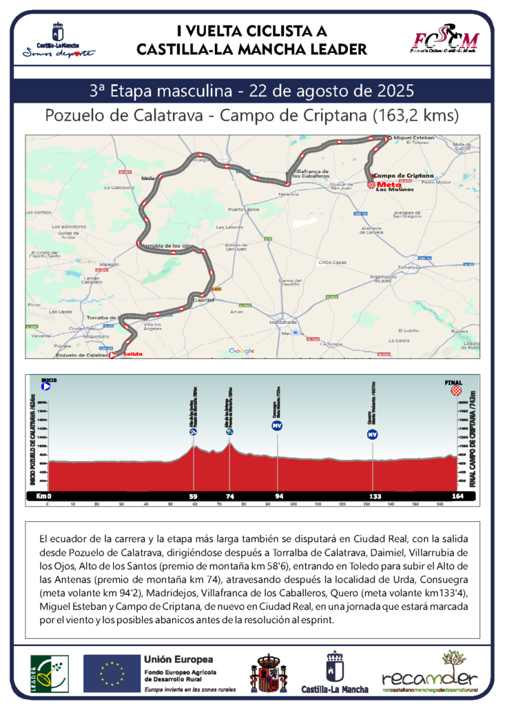 Especial atención a la tercera etapa (viernes 22 de agosto), con salida desde Pozuelo de Calatrava y llegada a Campo de Criptana (162 km), que tendrá como puntos intermedios nuestra localidad (hora estimada 12:13), así como otras próximas como Urda (11:56h) o Madridejos (12:19h).