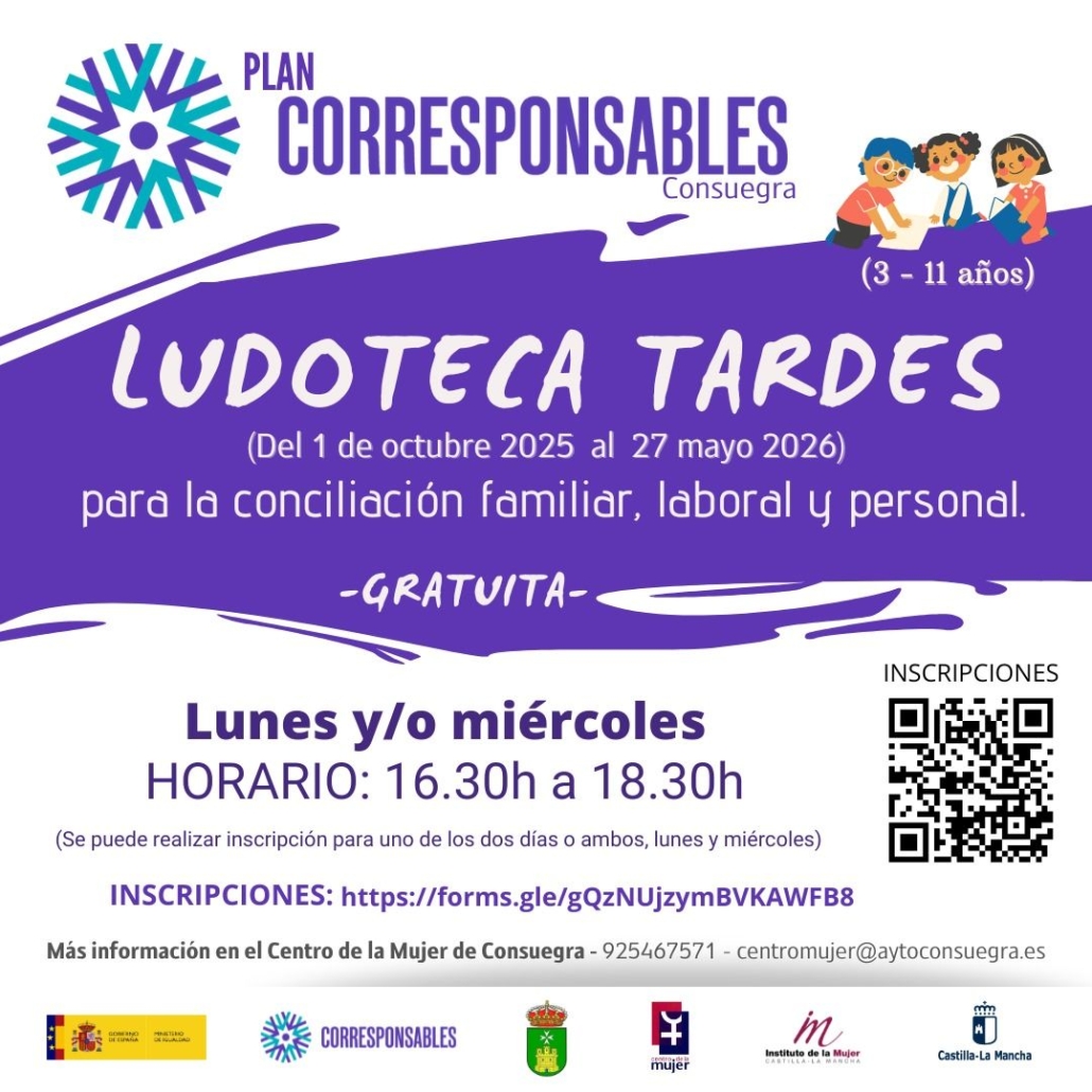 El Ayuntamiento de Consuegra, a través del Centro de la Mujer, y dentro del programa «Plan Corresponsables 2025/2026«, con el objetivo de conciliar la vida familiar, laboral y personal, pone en marcha servicio de LUDOTECA para los más pequeños.