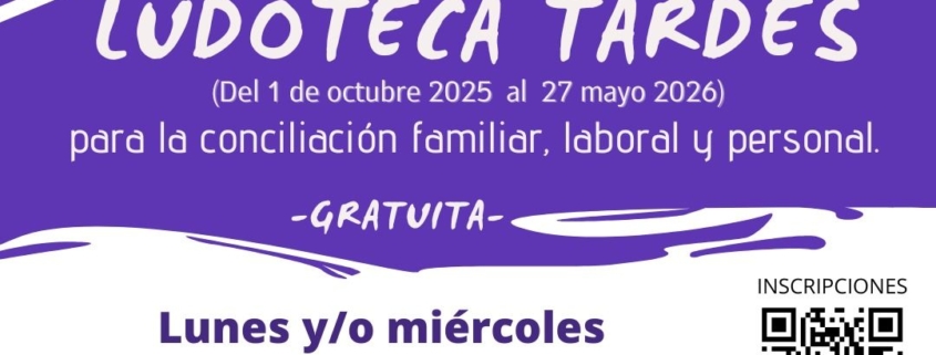 ABRIMOS PRE-INSCRIPCIONES para el servicio de LUDOTECA del Plan Corresponsables curso 2025/26, que se desarrollará los lunes y los miércoles en horario de 16.30h a 18.30h, desde el 1 de octubre de 2025 al 27 de mayo de 2026.