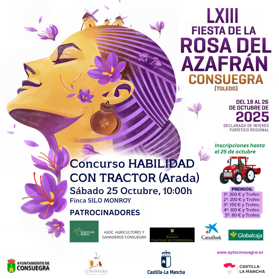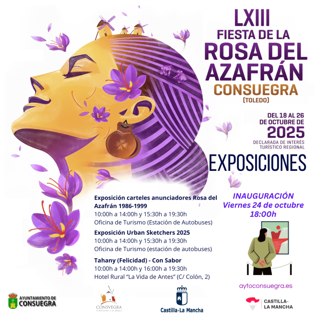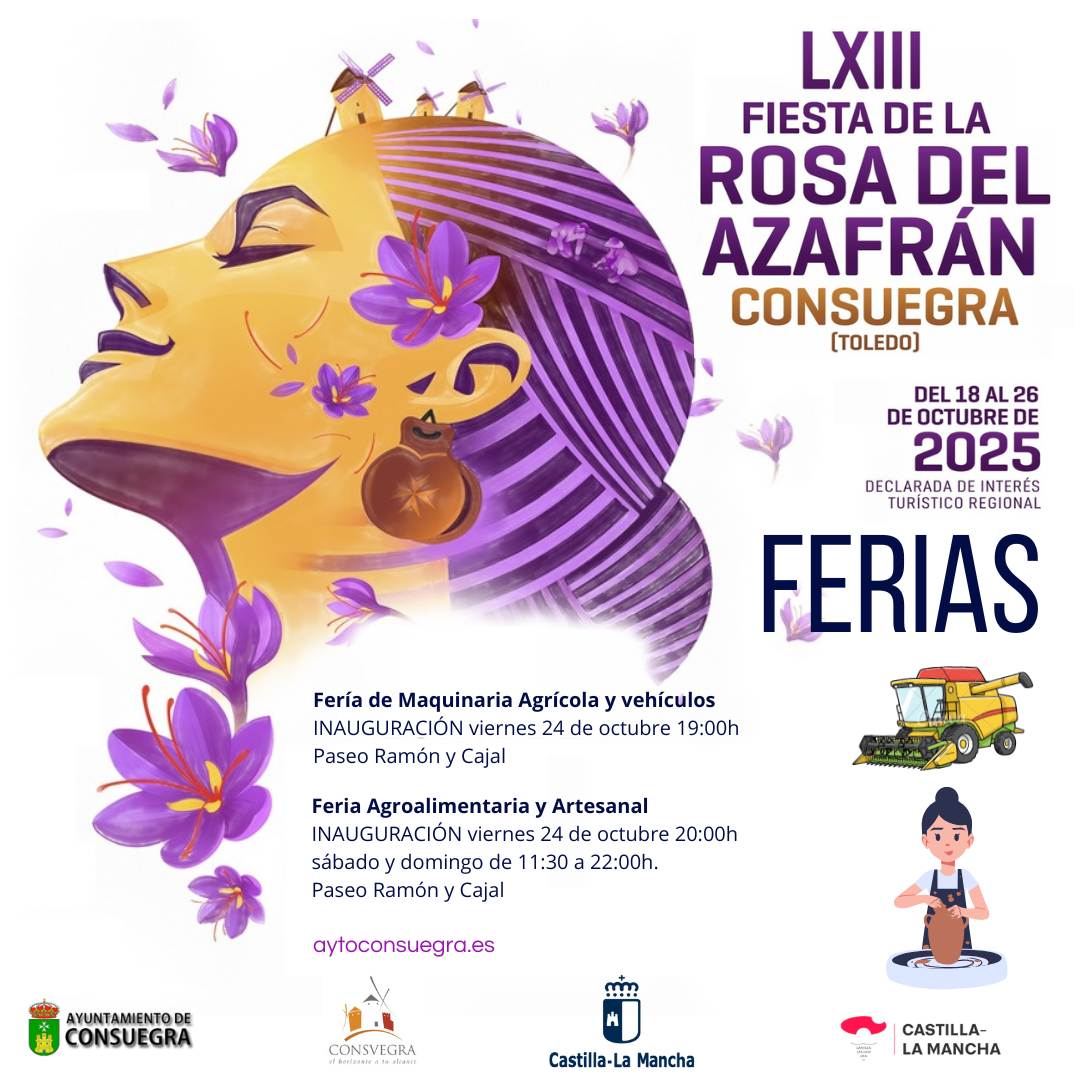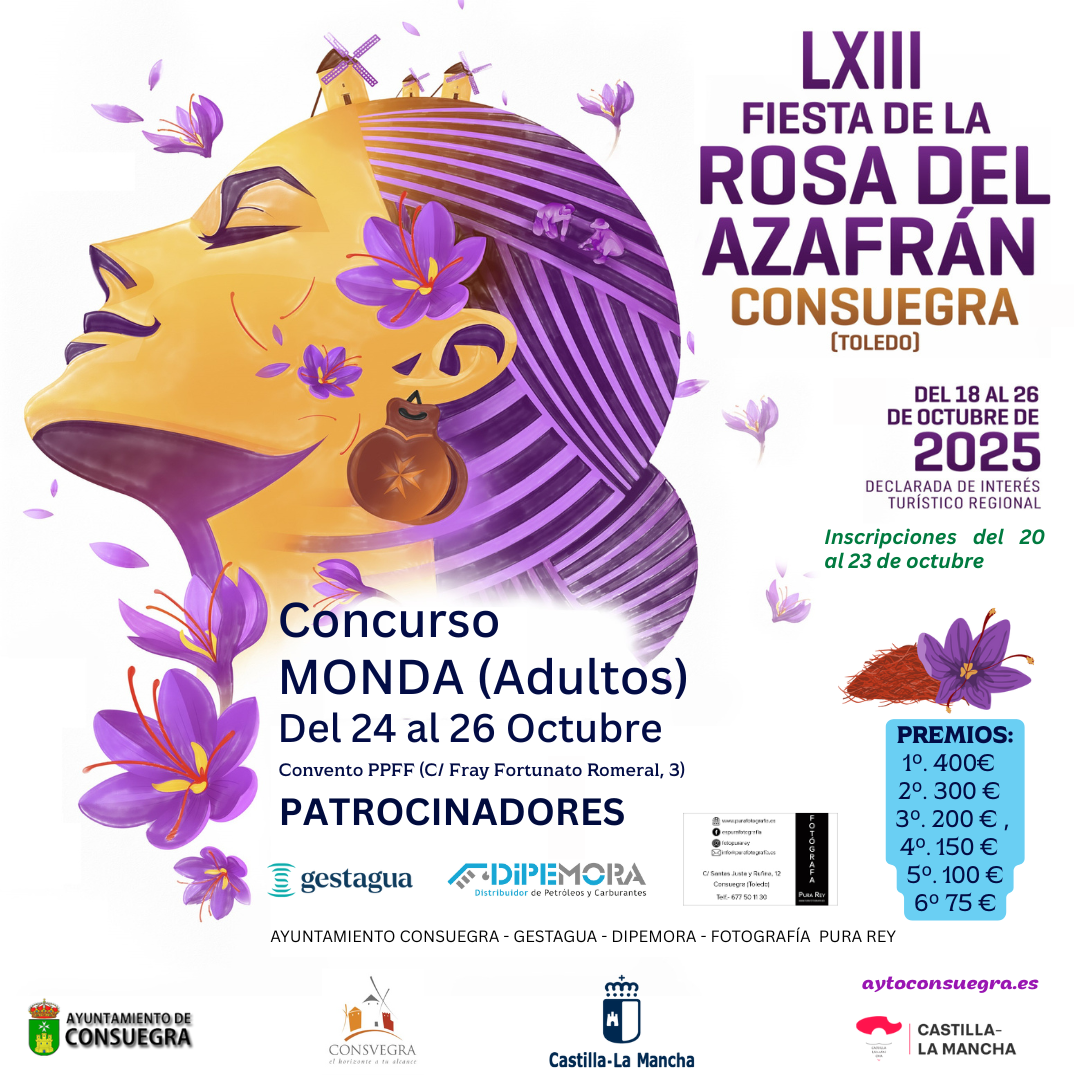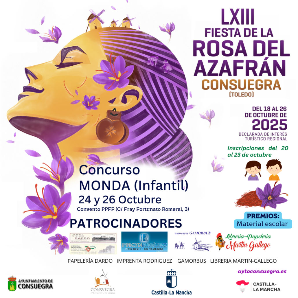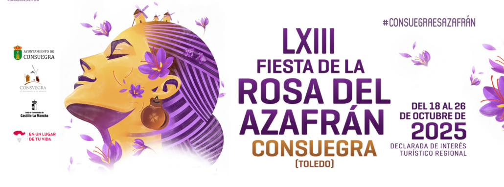 Bienvenidos a la 63 edición de la Fiesta Rosa del Azafrán 2025, Declarada de Interés Turístico Regional, del 18 al 26 de octubre.Desde el año 1963 y cada último fin de semana de octubre se realiza la Rosa del azafrán en Consuegra, situada en medio de la llanura manchega en plena ruta de Don Quijote, declarada de interés turístico regional. Durante esos días podrás disfrutar del folclore tradicional, concursos de monda de la Rosa del azafrán, productos agroalimentarios, molienda de la paz, visitas guiadas tematizadas…