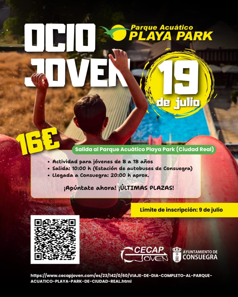 VIAJE DE DÍA COMPLETO AL PARQUE ACUÁTICO «PLAYA PARK» DE CIUDAD REAL INFORMACIÓN DEL VIAJE ¡Disfruta de un día completo de toboganes, piscinas y diversión asegurada! Dentro del programa de actividades juveniles de verano, desde CECAP JOVEN, en colaboración con el Ayuntamiento de Consuegra, se ha organizado una salida especial al Parque Acuático Playa Park (Ciudad Real), dirigida a jóvenes de 8 a 18 años.