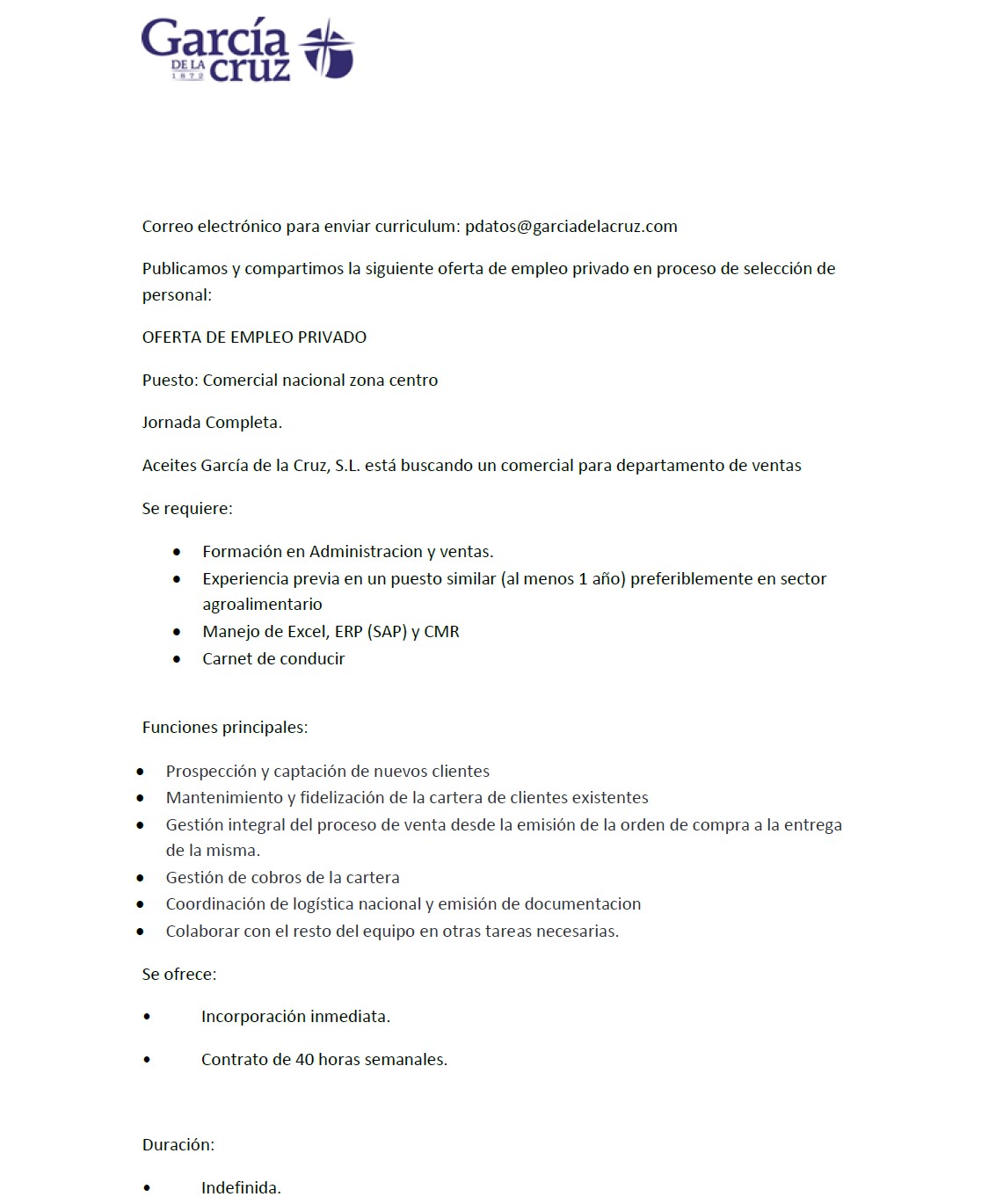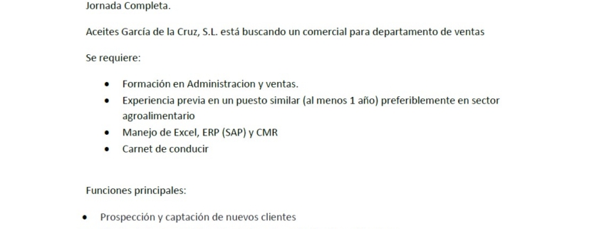 Oferta de empleo privado: Comercial nacional zona centro (Aceites García de la Cruz)