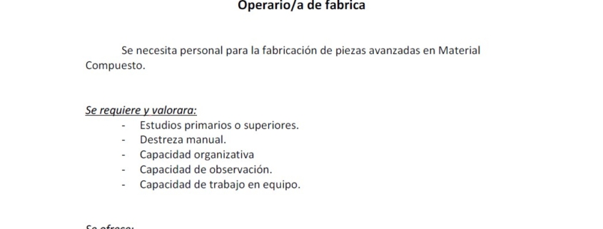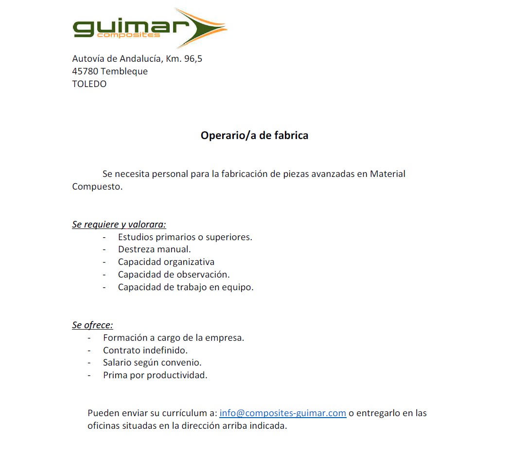 Oferta de empleo privado: Operario de Fábrica (Guimar Composites)