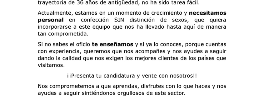 Actualmente, estamos en un momento de crecimiento y necesitamos personal en confección SIN distinción de sexos, que quiera incorporarse a este equipo que nos ha llevado hasta aquí de manera tan comprometida.