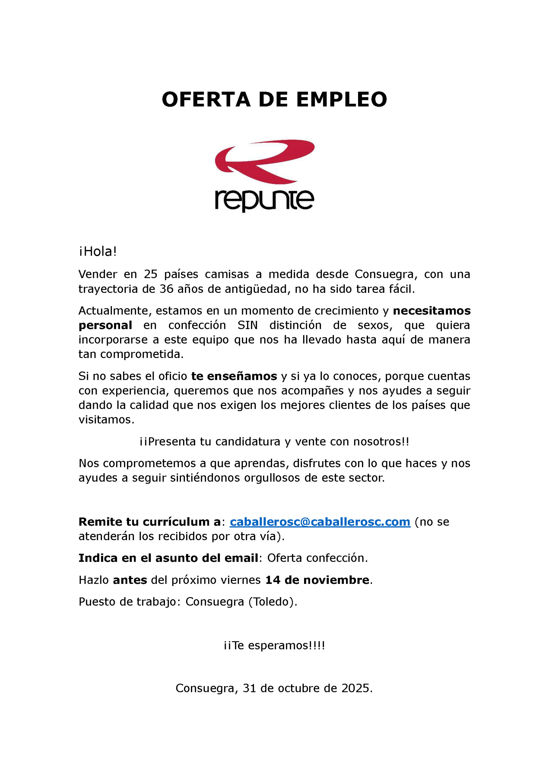Oferta de empleo REPUNTE-Operarios de confección.
