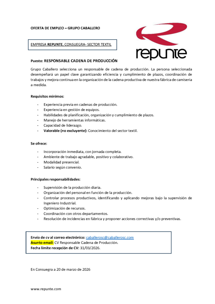 Oferta de empleo privado: Responsable de cadena de producción (Repunte – GRUPO CABALLERO)