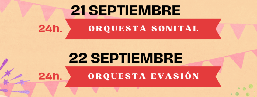 DÍA 20 ORQUESTA TAXXARA (@orquestataxxara)DÍA 21 ORQUESTA SONITAL (@sonitalorquesta)DÍA 22 ORQUESTA EVASIÓN (@orquesta_evasion_oficial)DÍA 23 ORQUESTA JELMI (@jelmiorquesta)DÍA 24 ORQUESTA LA GIRA (@orquestalagira) |