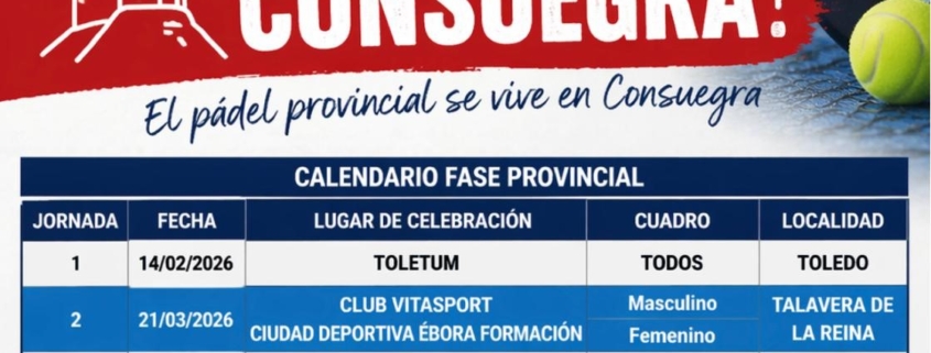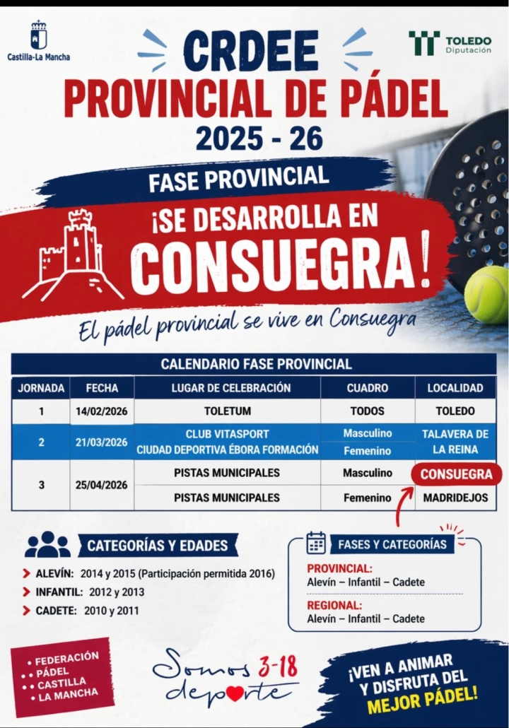 Sábado 25 abril se podrá presenciar en Consuegra la jornada de pádel provincial en edad escolar del programa Somos Deporte 3-18, que organiza la Junta de Comunidades de CLM y la Diputación de Toledo en colaboración con la Federación de pádel de CLM, clasificatorio para el campeonato regional.
