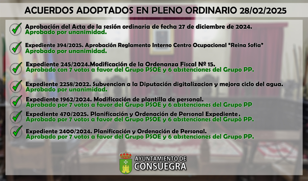 Por Resolución de Alcaldía 2025/261 queda convocada SESIÓN ORDINARIA del Pleno, que tendrá lugar el próximo día 28 de febrero de 2025 a las 21:00 horas, en el Salón de Actos del Ayuntamiento, con el siguiente orden del día.