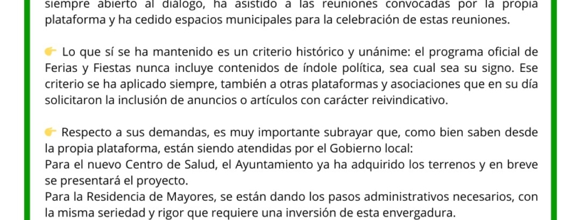 Respecto a sus demandas, es muy importante subrayar que, como bien saben desde la propia plataforma, están siendo atendidas por el Gobierno local.