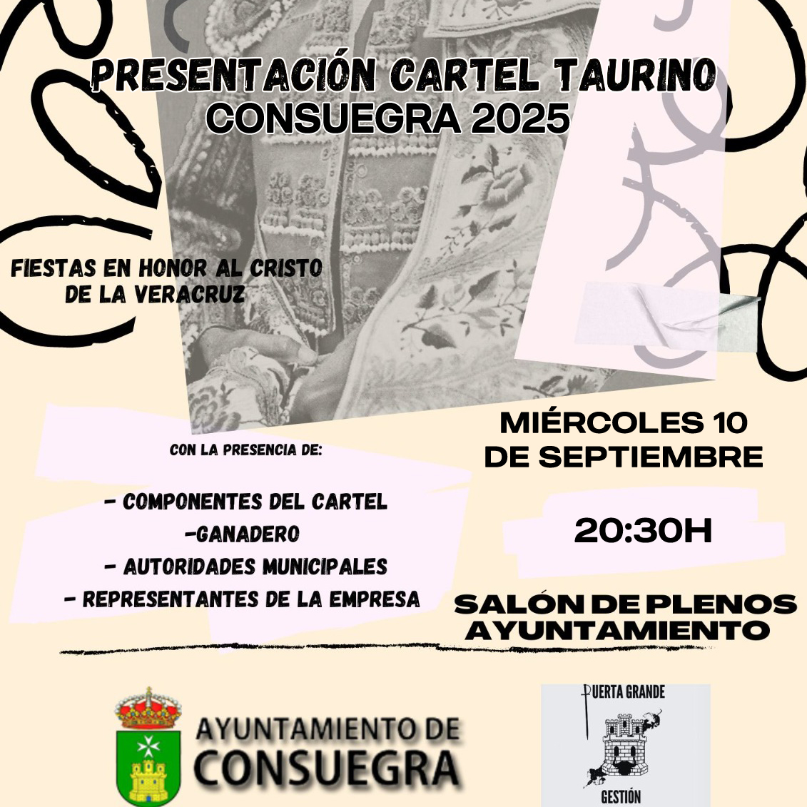 El próximo día 10 de septiembre tendrá lugar la presentación del cartel taurino Ferias Fiestas Consuegra 2025 en el Salón de Plenos del Ayuntamiento a las 20:30h.