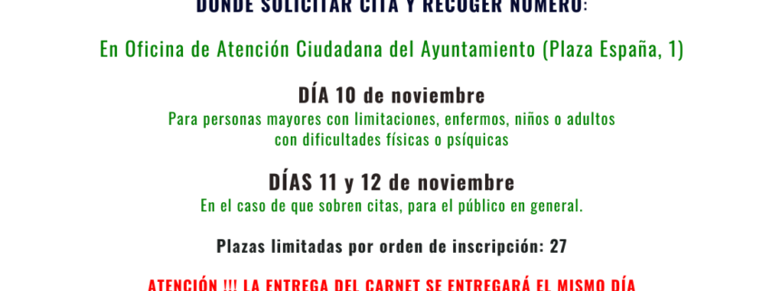 ¡ATENCIÓN! Las CITACIONES y recogida de números se entregan en Oficina de Atención Ciudadana del Ayuntamiento (Puesto 1), en horario de 9:00 a 14:00h: