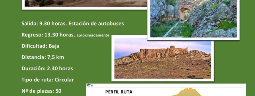 | Distancia: 7,5 km. Tipo de ruta: Circular Duración: 2,30 horas Dificultad: Baja Regreso: 13:30 horas, aprox. Plazas limitadas: 50 Precio: 3€ participantes con seguro o federados con tarjeta bancaria ingreso a cuenta – 3€ para participantes sin seguro con tarjeta bancaria ingreso a cuenta + 4 € de seguro (en metálico) OBLIGATORIO: Estar federado/a o disponer del «seguro de un día» |