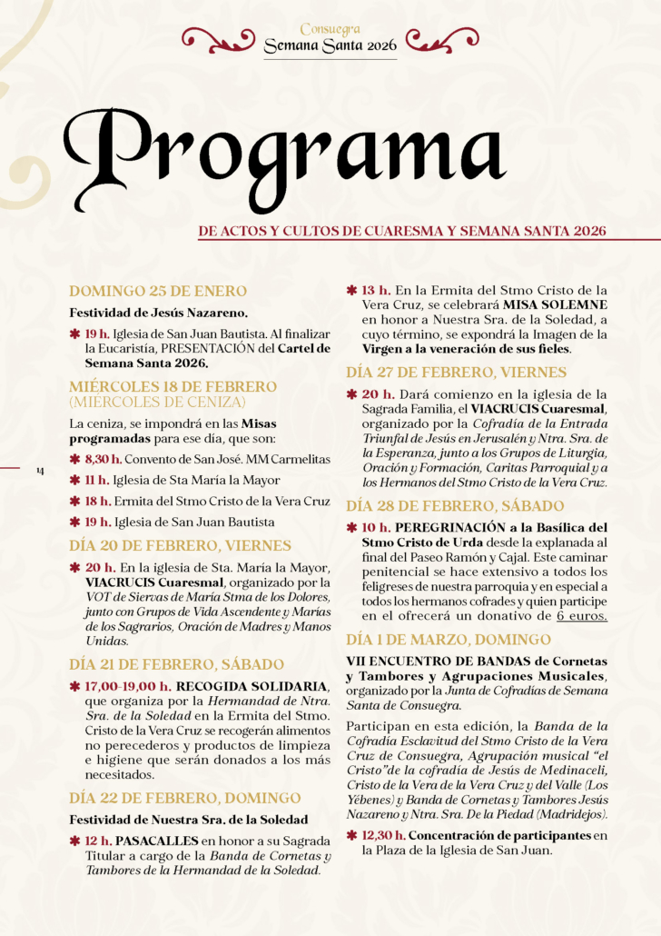 La Junta de Cofradías y Hermandades de Consuegra y la Parroquia de Santa María, y con la colaboración del Excmo. Ayuntamiento de Consuegra, presentan la programación de los actos y cultos litúrgicos con motivo de la Semana Santa 2026.