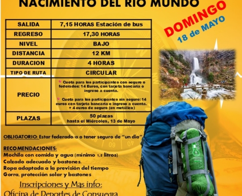 El Área Municipal de Deportes del Ayuntamiento de Consuegra organiza la siguiente ruta senderista, Ruta PNCM-S03 "DE RIOPAR AL NACIMIENTO DEL RIO MUNDO" CUANDO: Domingo 18 de mayo de 2025