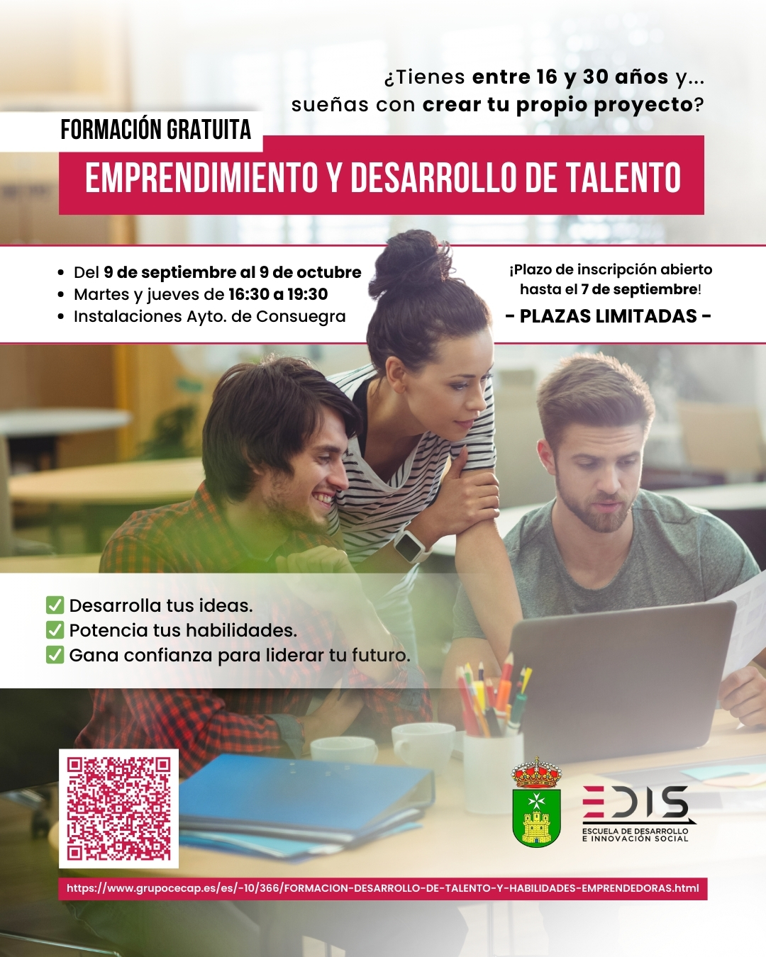 ✨ ¿Tienes entre 16 y 30 años y sueñas con crear tus propios proyectos? ¡Este es tu momento! 🙌 En Consuegra ponemos en marcha el taller formativo “Habilidades emprendedoras y Desarrollo de Talento”, promovido por el Ayuntamiento de Consuegra e impartido por EDIS (Escuela de Desarrollo e Innovación Social) del Grupo de Entidades Sociales CECAP.