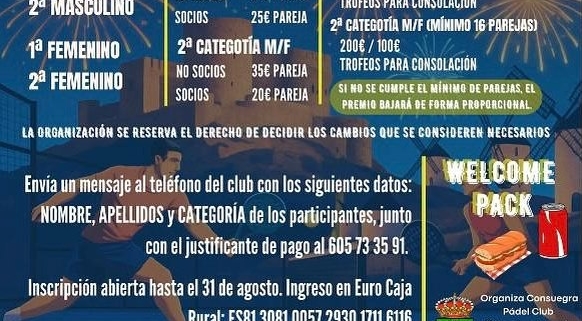 | INSCRIPCIONES abiertas hasta el 31 de agosto. Ingreso en la cuenta bancaria que se indica en cartel informativo. Enviando un mensaje con los nombres, apellidos, y categoría de los participantes junto con el justificante de pago al 605 733 591. |