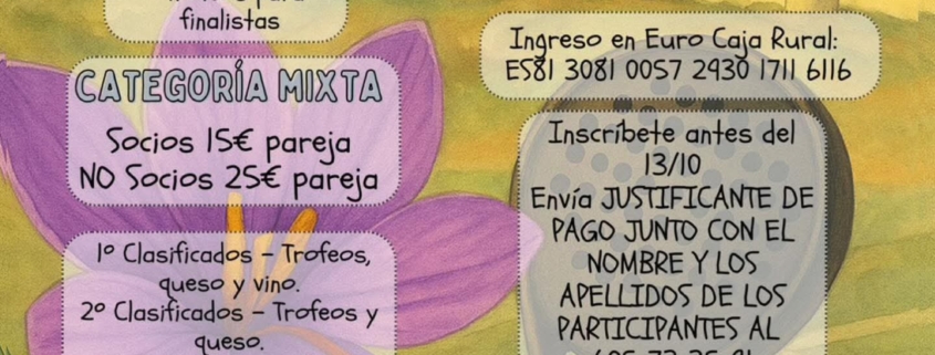 Consuegra Padel Club con la colaboración de la Concejalía de Deportes del Ayuntamiento de Consuegra organiza TORNEO MIXTO, con motivo de la 63 Fiesta Rosa del Azafrán 2025.