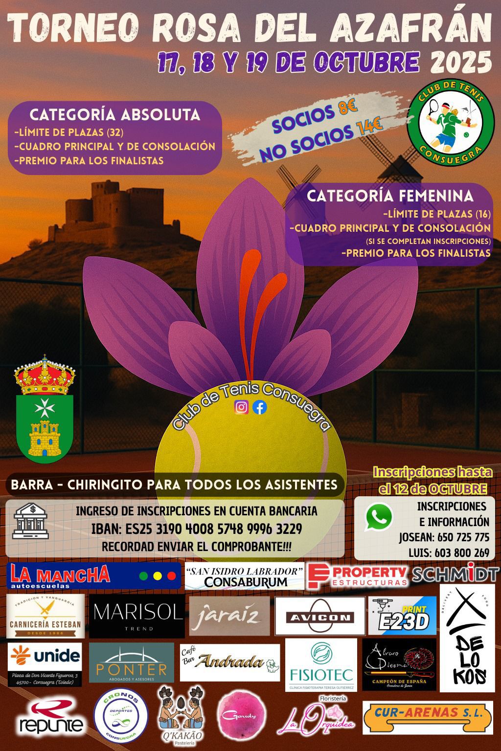 El Club de Tenis Consuegra con la colaboración del Excmo. Ayuntamiento de Consuegra organiza TORNEO DE TENIS, con motivo de la fiesta Rosa del Azafrán 2025.