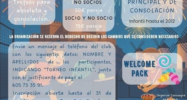 Consuegra Padel Club con la colaboración de la Concejalía de Deportes del Excmo. Ayuntamiento de Consuegra organiza TORNEO INFANTIL DE PADEL, con motivo de las Ferias y Fiestas 2025, del 5 al 7 de septiembre.