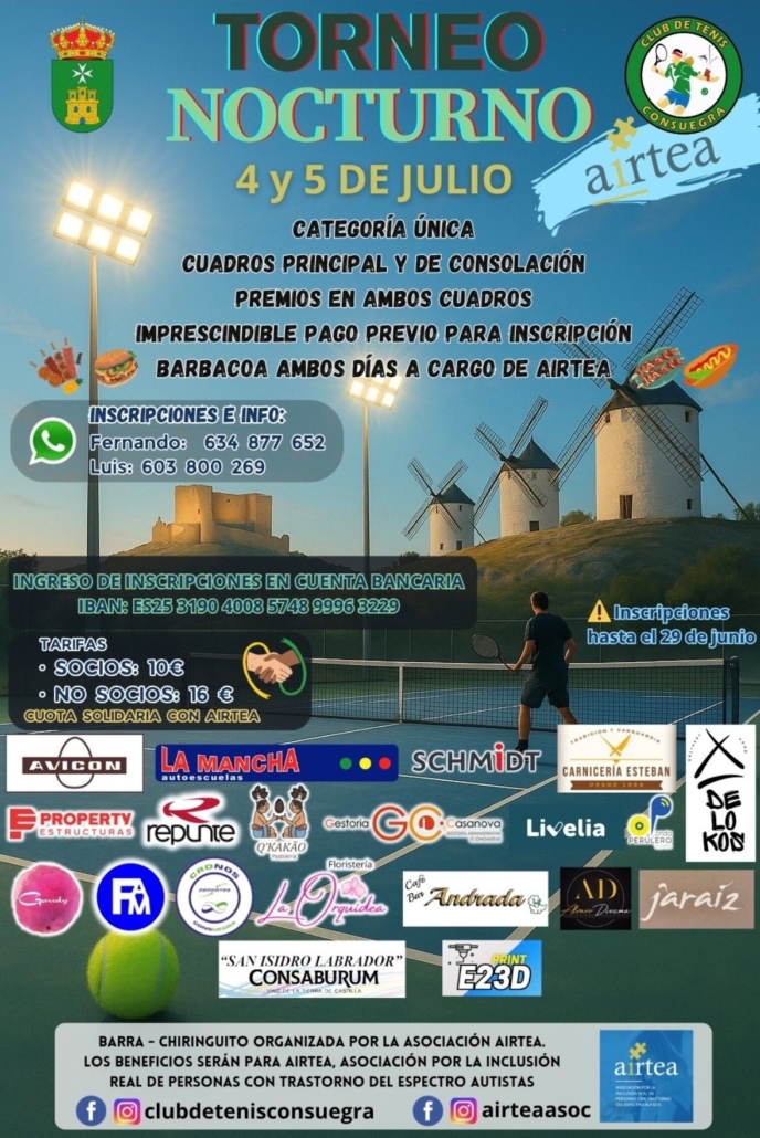 El Club de Tenis Consuegra con la colaboración con el Excmo. Ayuntamiento de Consuegra, organiza TORNEO NOCTURNO DE TENIS, los días 4 y 5 de julio, en beneficio de AIRTEA, asociación que ayuda y colabora con las personas autistas y sus familiares.