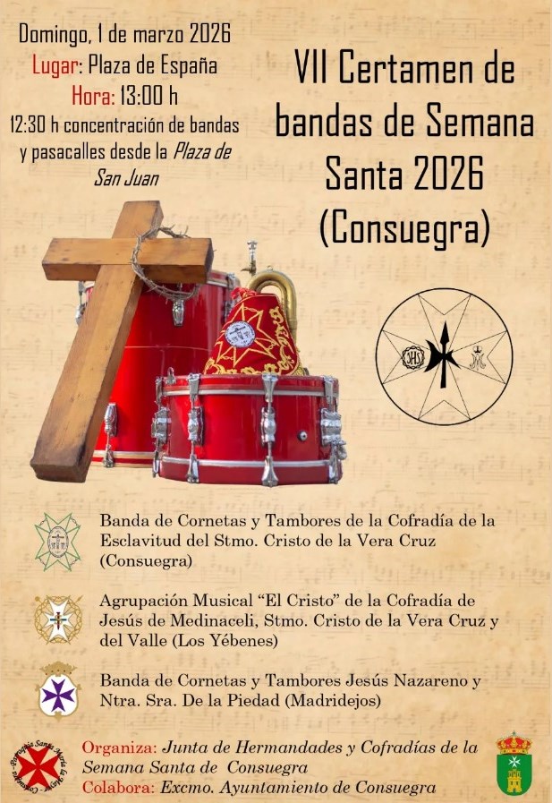 La Junta de Cofradías y Hermandades de Consuegra, con la colaboración del Excmo. Ayuntamiento de Consuegra, organiza el VII Certamen de Bandas de Cornetas y Tambores (CCTT) SEMANA SANTA 2026, el próximo 1 de marzo en Plaza España.